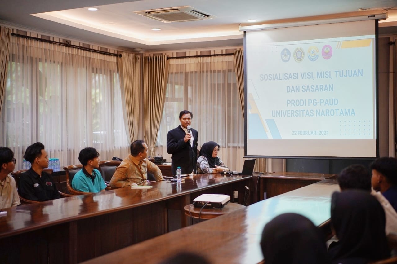 Pada tanggal 22 Februari 2021 Program Studi Pendidikan Guru Pendidikan Anak Usia Dini (PGPAUD) Universitas Narotama menggelar kegiatan sosialisasi Visi, Misi, Tujuan, dan Sasaran (VMTS) di Ruang Rapat Gedung D Universitas Narotama. Kegiatan ini bertujuan untuk menyamakan pemahaman seluruh ........
