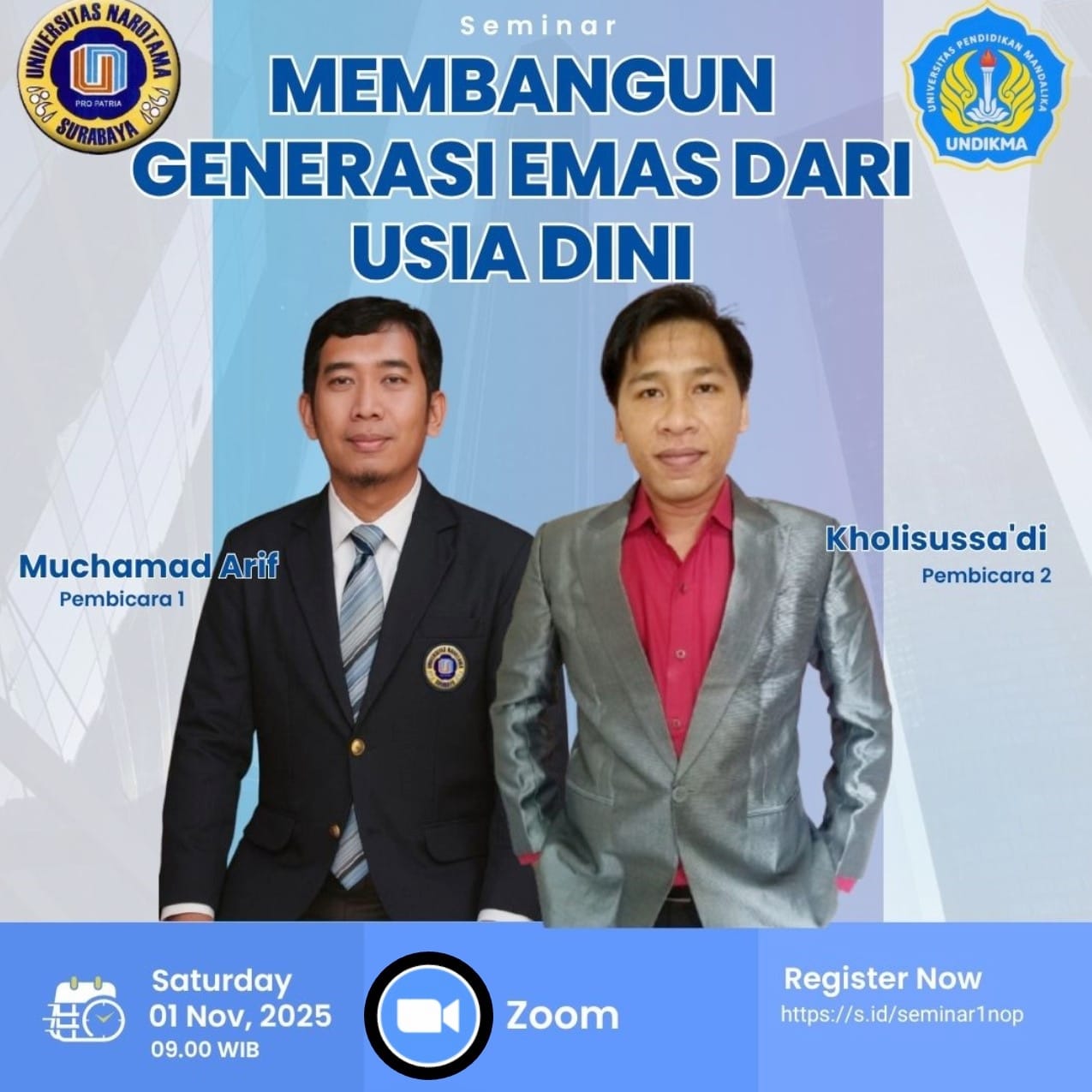 Fakultas Keguruan dan Ilmu Pendidikan Universitas Narotama kembali menggelar kegiatan ilmiah bertajuk “Membangun Generasi Emas Usia Dini”. Kegiatan webinar ini hadirkan Narasumber Inspiratif Muchamad Arif, S.Pd., M.Pd. dan Kholisussa’di, S.Pd., M.Pd., yang membagikan wawasan se........