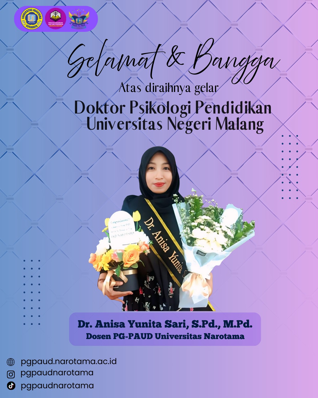 Prestasi membanggakan kembali diraih FKIP Universitas Narotama. Dosen PG PAUD, Dr. Anisa Yunita Sari, S.Pd., M.Pd., sukses menyelesaikan ujian disertasi Program Doktor (S3) Psikologi Pendidikan Fakultas Psikologi Universitas Negeri Malang pada 6 Januari 2026. Disertasinya mengkaji peran dukungan rekan kerja, otonomi, dan efikasi diri terhadap kepuasan kerja ........